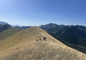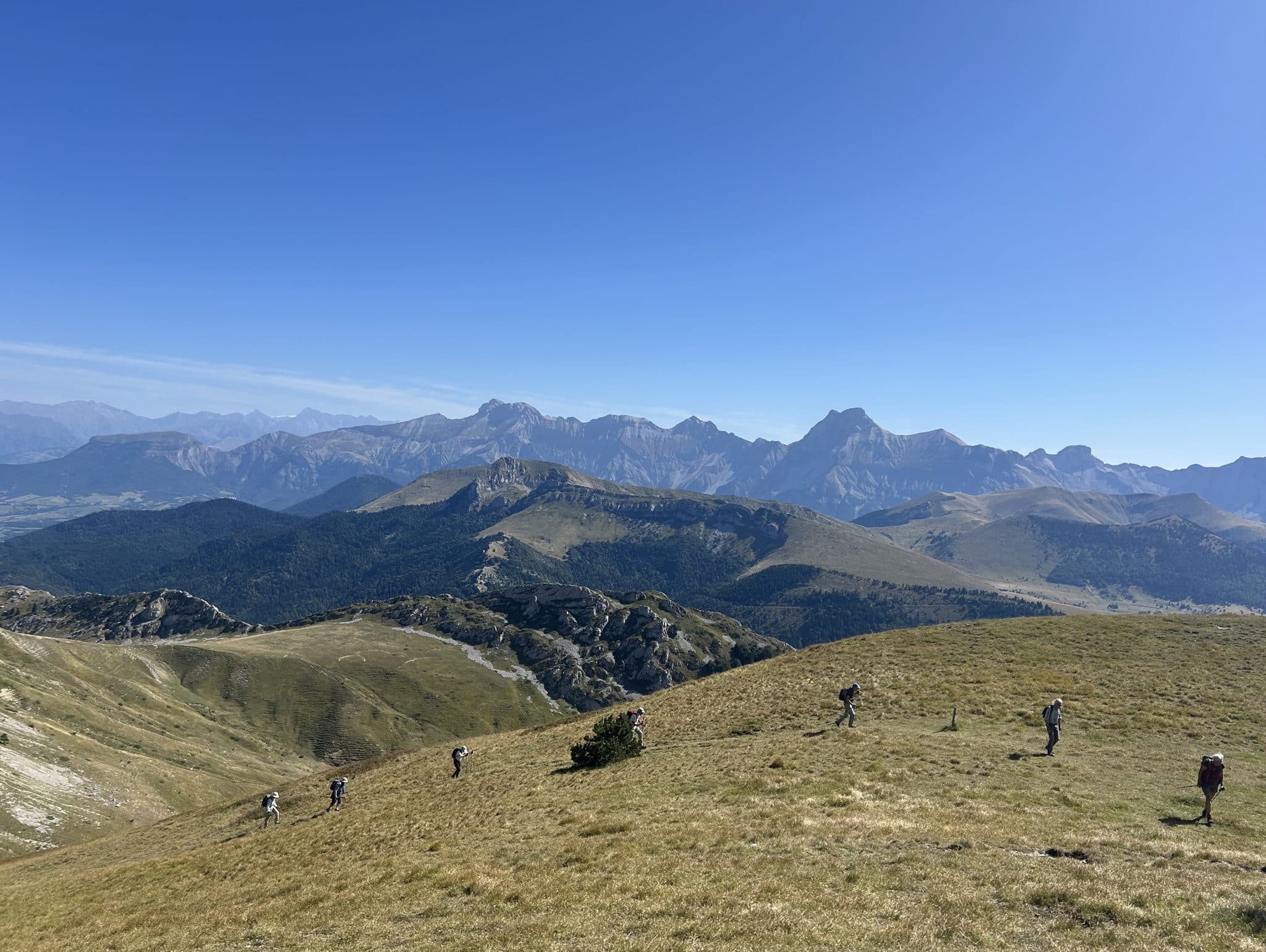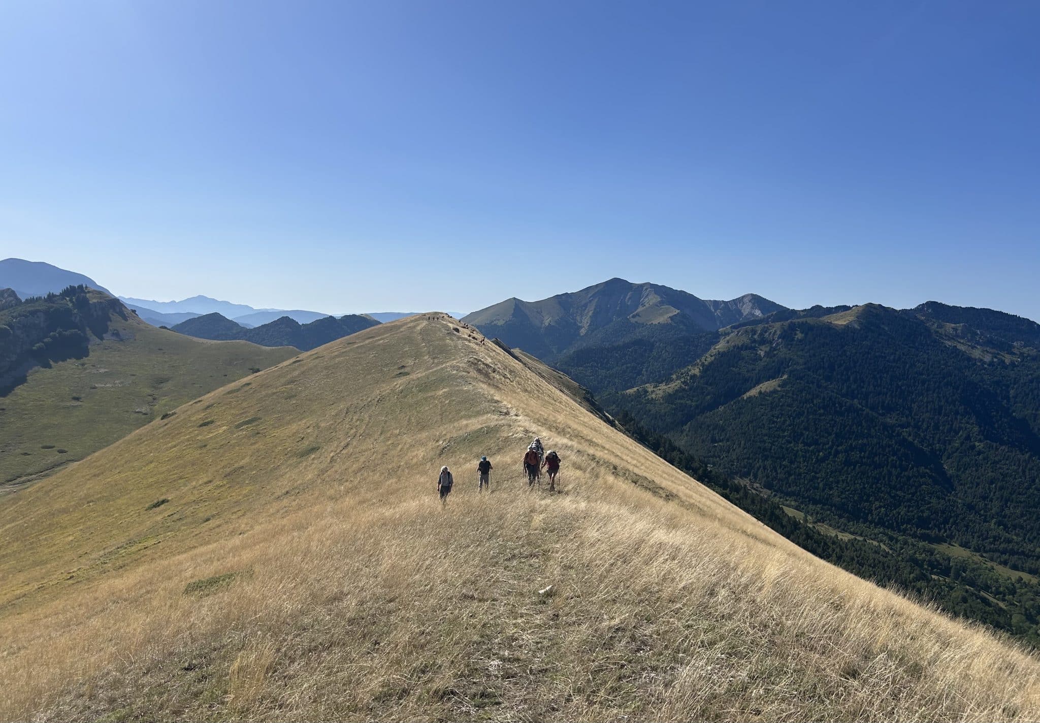 Neuf, ce matin, au départ sur la route du Col de Grimone. Nous grimpons pour attraper la crête des Gleysettes, la suivre, enchaîner les cols, Vente-cul et Pigeon, et atteindre le sommet, l’ultime rebord à 2051 m,