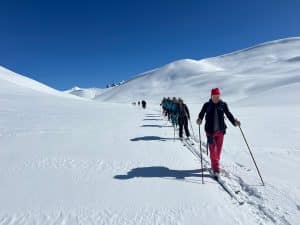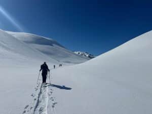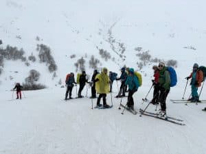 Le point de vue d’une skieuse : Ce matin il fait un temps splendide , la grande dame de la Meije trône devant nous; nous lui tournons d’abord le dos en quittant le sympathique refuge du pic du Mas de la Grave à 2170m; une chute de neige cette nuit a tapissé le vallon du Ga , parsemé de bergeries qui furent autrefois habitées( 150 âmes) et c’est dans cette merveilleuse poudreuse que skieurs et raquetteurs impriment une belle trace ; la pente se redresse et voilà le col de la Cabanotte duquel nous admirons au loin les aiguilles d’Arves et l’imposant Goléon. Alors nous nous faufilons dans un vallon sinueux, le Rif Tort , à travers des dunes de neige ;