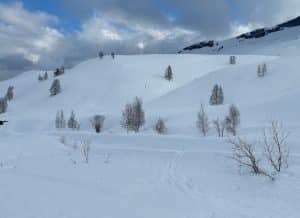 Nous cheminons le long d’un torrent caché par d’énormes monticules de neige. Tout autour ce ne sont que courbes douces et blanches.