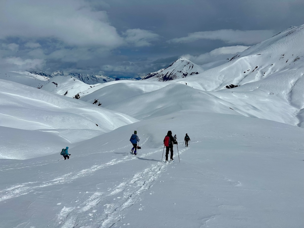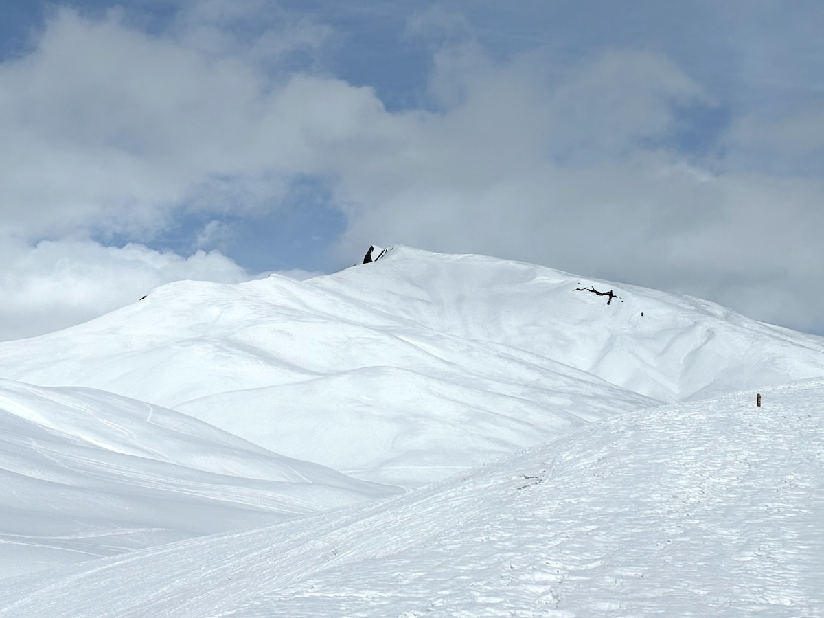 Nous cheminons le long d’un torrent caché par d’énormes monticules de neige. Tout autour ce ne sont que courbes douces et blanches.