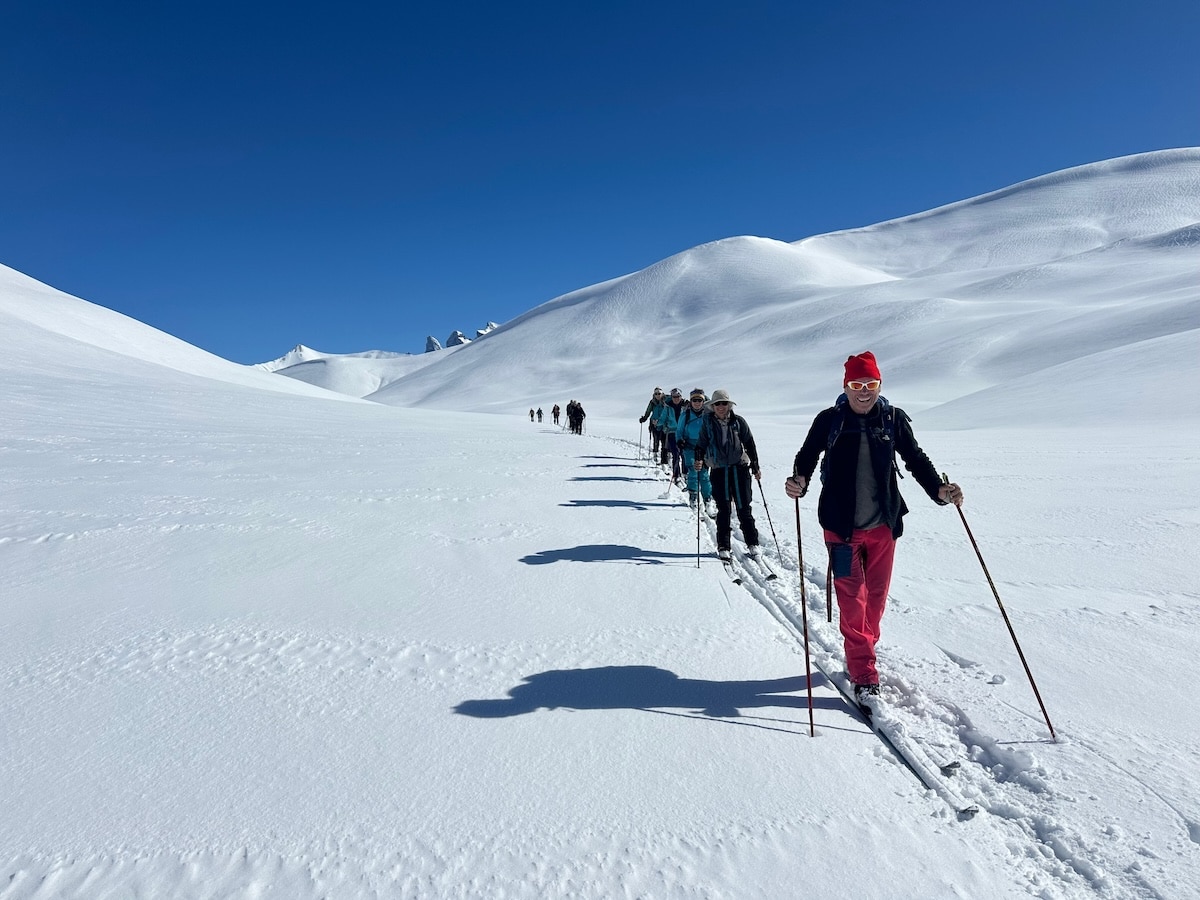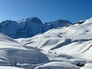 Le point de vue d’une skieuse : Ce matin il fait un temps splendide , la grande dame de la Meije trône devant nous; nous lui tournons d’abord le dos en quittant le sympathique refuge du pic du Mas de la Grave à 2170m; une chute de neige cette nuit a tapissé le vallon du Ga , parsemé de bergeries qui furent autrefois habitées( 150 âmes) et c’est dans cette merveilleuse poudreuse que skieurs et raquetteurs impriment une belle trace ; la pente se redresse et voilà le col de la Cabanotte duquel nous admirons au loin les aiguilles d’Arves et l’imposant Goléon. Alors nous nous faufilons dans un vallon sinueux, le Rif Tort , à travers des dunes de neige ;
