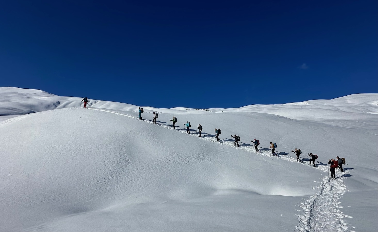 Mais nos chemins vont ensuite bientôt se séparer, car après le col du Souchet nous attend une longue zone de dévers toujours inconfortable à raquettes, que nous préférons écourter en gravissant droit dans la pente la bien nommée Serre Bernard… Au sommet nous apercevons en contrebas une ourse à skis jouant les électrons libres puis un peu plus loin le reste du groupe vers le sommet du téléski du plateau d’Emparis. La descente se fera par la piste noire non damée, agrémentée de nombreuses séquences de luge sur les fesses, provoquant quelques rires et cris de joie…Une magnifique journée ! Merci les Ours ! Pascal