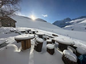 Le point de vue d’un raquetteur : Au réveil nous découvrons la jolie petite couche de neige fraîche déposée comme un billet doux, promesse d’une journée plus belle que nos nuits, difficiles pour certains dans ces dortoirs. La neige est douce sous nos raquettes et nous progressons en parallèle avec nos amis skieurs d’abord sur le même itinéraire que la veille puis sur ce vallon du Rif Tort bien tentant vers le sud-ouest jusqu’aux chalets bordant la zone plate et marécageuse parfaitement immaculée où nous piqueniquons ensemble.