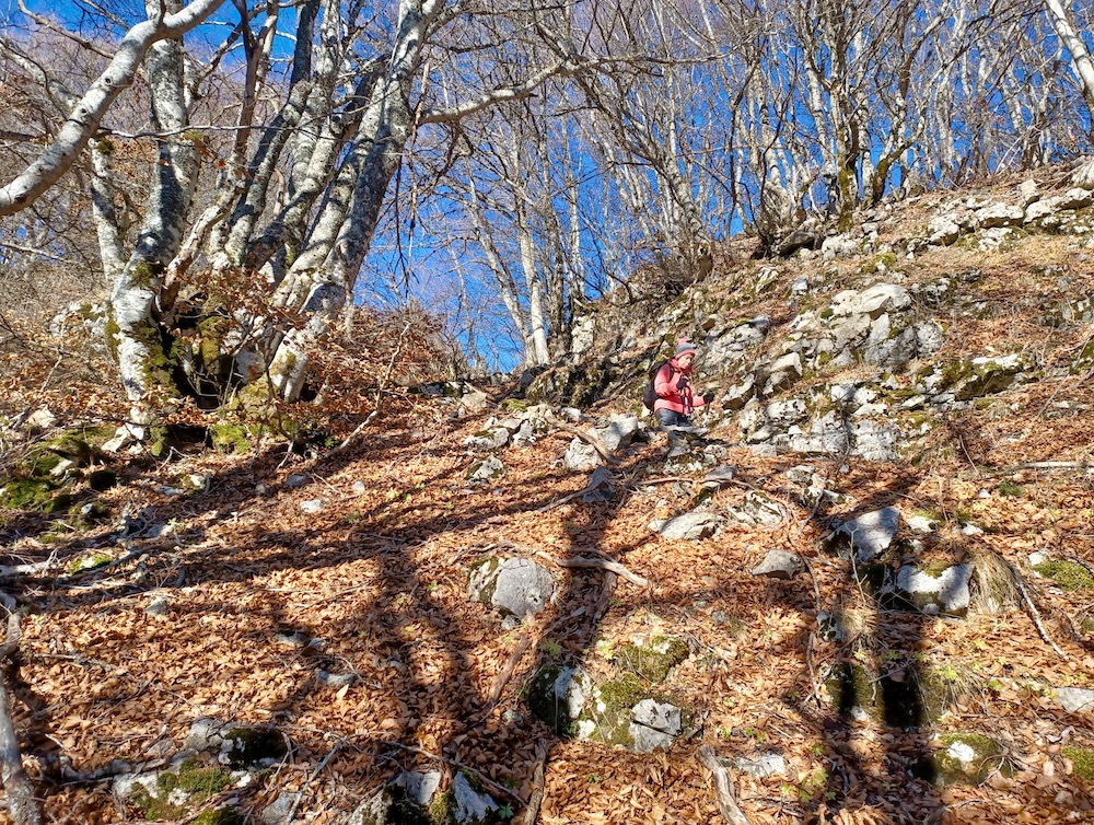 Nous descendons dans les feuilles d’automne et nous découvrons le clot Hubert (934 m), une cabane de l’ONF entourée d’immenses pins noirs, à coté d une belle prairie, un endroit nous invitant à revenir peut-être une nuit de pleine lune…pourquoi pas ?