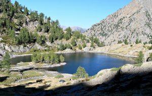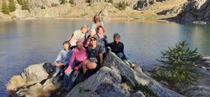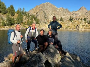 Face à notre refuge se dresse la Caïre de Cougourde qui nous toise de ces 2921m. Nous voilà tous regroupés pour un départ un peu avant 8H et là une conversation s’engage sur le lever des poules du poulailler tout proche ! qui ne sont pas au RDV, alors est-ce « le loup, le renard ou la belette qui cette nuit, ont festoyé ? » , nous ne saurons pas, car il nous faut enfin partir pour notre nouvelle destination. Nous prenons la direction du très beau lac de Trecolpas et après quelques centaines de mètres, nous apercevons notre 1er chamois de la journée et ce ne sera pas le dernier ! au bout de 45mn le lac se dévoile, dans la lumière du matin. Nous décidons de nous y arrêter un instant, non pas pour une baignade (trop tôt), mais pour une pause photo sur un rocher de la petite île du bout du lac. A chacun leur tour, les Ourses et Ours prennent la pose, pour la photo groupe du jour !