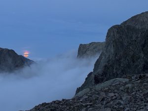 Avant de regagner notre sac de couchage, le gardien nous invite à observer le lever de lune, teinte orangée sur la crête des montagnes. Moment magique ! Nadia
