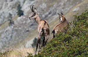 Nous quittons le refuge sous un ciel gris blanc, la température est agréable. Le sentier en herbe monte tranquillement jusqu’à 2 lacs, dans lesquels les reflets des montagnes nous invitent à un arrêt photo. Des chamois adultes et jeunes nous accompagnent.