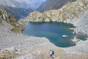 Rapidement en Italie face à une descente bien rocailleuse (gros blocs), nous suivons le balisage d’un trait rouge et blanc + cairns parfois. Le « Lago Bianco dell’Agnel » (2292 m) est vite repéré d’en haut. Deux ours ne résistent pas et se baignent dans une eau claire d’altitude. Le soleil les illumine. Un névé tout au bord ne semble pas les glacer ! Pour tous, un temps ressourçant au milieu de cette grande randonnée d’expert ! Notre journée se poursuit sur un sentier tracé jusqu’au Refuge Pagari situé à 2650 m. De jeunes chamois nous observent ; on ne se lasse pas de s’arrêter pour les admirer chaque jour.