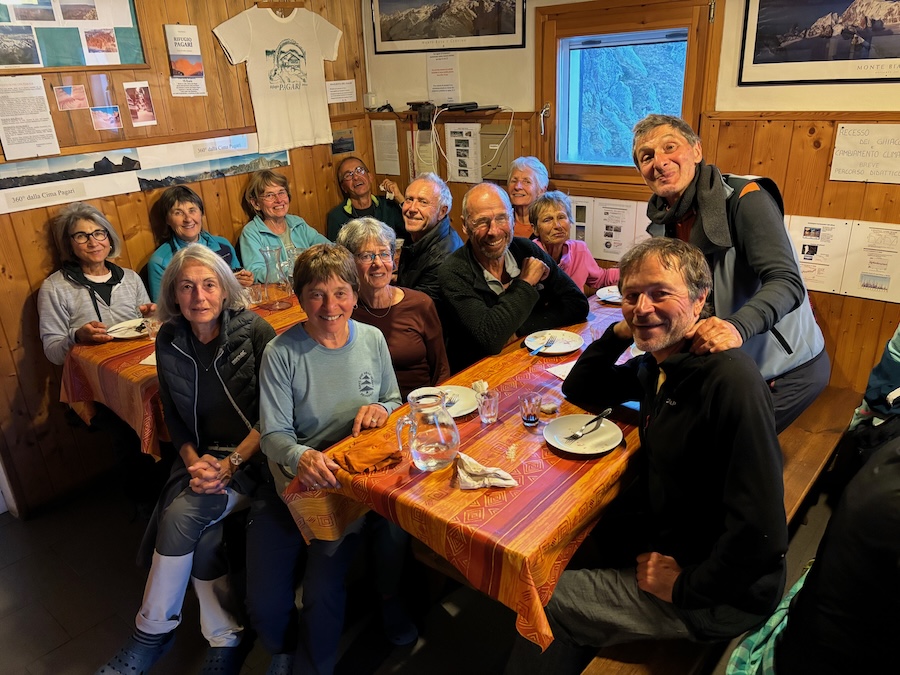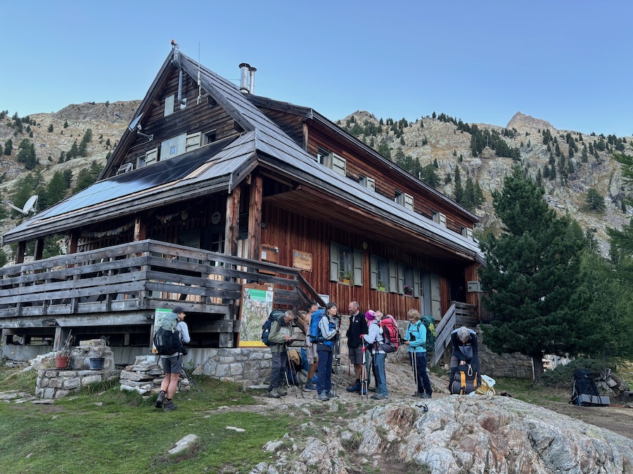 Nous arrivons au refuge de Pagari, refuge niché sur un promontoire à 2650m. Le picnic est pris à l’intérieur pour les plus frileux ou dehors pour les autres. Un café italien, ristretto ou lungo, agrémente la pause repas. Puis les Ours-es se dispersent, sieste, contemplation du paysage minéral, discussion…