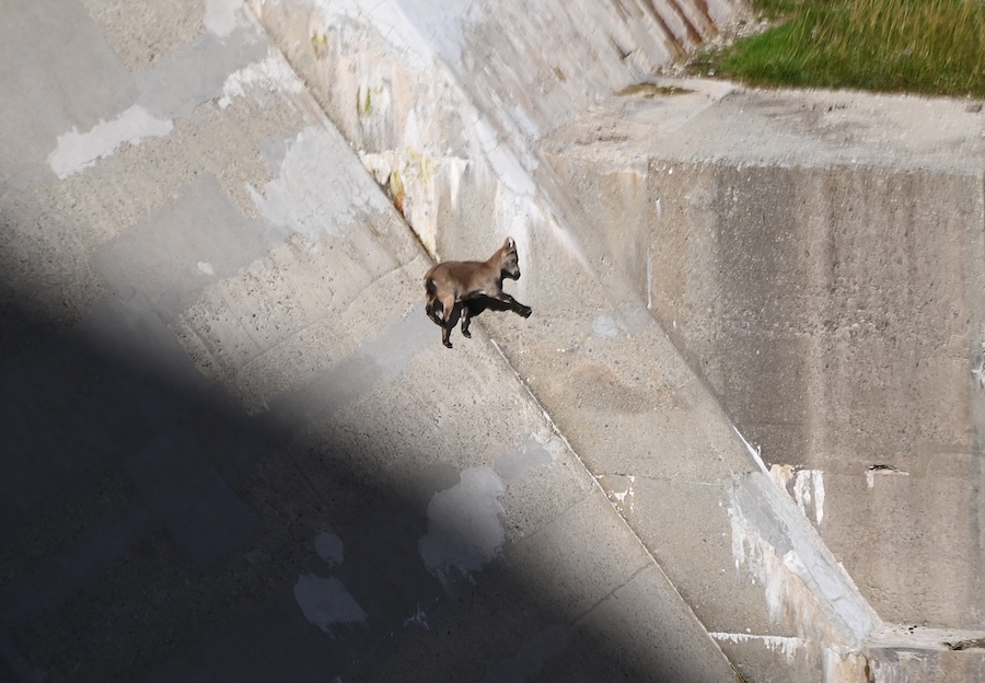 Après une sieste bien méritée, nous remontons en direction du Pas de Mt Colomb, là un passage étroit nous laisse entrevoir une descente vertigineuse. Heureusement au début de la descente, des marches ont été taillées dans la roche, ce qui rassure certains d’entre nous. La descente se poursuit dans de gros blocs rocheux, qui occasionnent quelques déséquilibres. Mais plus de peur que de mal, nous arrivons enfin au barrage de la Barme. Sur la paroi inclinée du barrage, nous remarquons, un chamois acrobatique qui se délecte de sels minéraux, lui au moins n’a pas de problème d’équilibre !!!