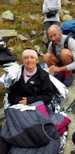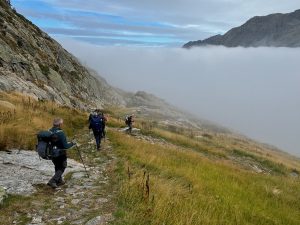 Ce sont donc les 13 Ours qui entament tranquillement la longue descente vers le petit hameau de San Giacomo où parait-il on trouve un café !! Le chemin est très bien tracé et facile, (ça nous change), les chamois et bouquetins toujours aussi nombreux à nos côtés, c’est un émerveillement sans cesse renouvelé. Çà bavarde, Christiane a pris la tête du groupe, on évoque encore la discussion de la veille sur la circonférence de la Lune tout en s’enfonçant petit à petit dans les nuages. Brutalement Grande Ourse chute et se retrouve la tête sur un gros caillou : accident heureusement sans gravité mais qui mobilise tout le groupe pendant un bon moment, le temps de quelques soins et de reprise de nos esprits.