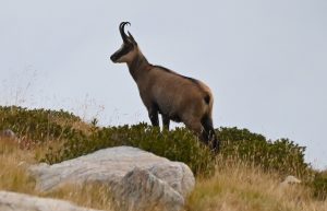 Très vite, un chamois nous surplombe et nous fixe du regard. Un autre, curieux sans doute, passe la tête par-dessus un rocher pour voir ce qui intrigue son congénère et cela nous amuse, puis apparaît un petit de l’année et cela nous attendrit.