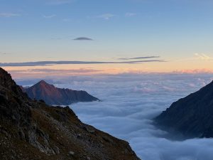Magnifique lever de Soleil ce matin au-dessus d’une mer de nuages située selon notre gardien vers 1800 m d’altitude. Nous sommes bien au-delà à 2650 m ! et levés à 6h30 aujourd’hui (la journée risque d’être longue avec une météo médiocre), nous profitons de ces moments de silence et d’immensité. Sur les conseils du gardien nous avons décidé de renoncer à faire passer un groupe par le Bivouac Moncalieri et son passage sur des dalles inclinées très exposées.