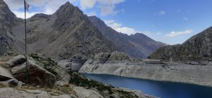 A l’extrémité du lac nous prenons de la hauteur direction le colle del Chapious. Nous avons alors vue plongeante sur le barrage et nous interrogeons sur la courbure idéale pour la solidité d’un tel édifice.