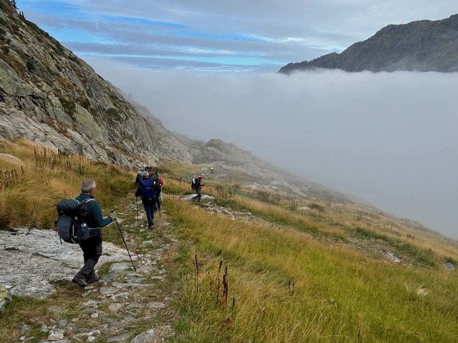 Ce sont donc les 13 Ours qui entament tranquillement la longue descente vers le petit hameau de San Giacomo où parait-il on trouve un café !! Le chemin est très bien tracé et facile, (ça nous change), les chamois et bouquetins toujours aussi nombreux à nos côtés, c’est un émerveillement sans cesse renouvelé. Çà bavarde, Christiane a pris la tête du groupe, on évoque encore la discussion de la veille sur la circonférence de la Lune tout en s’enfonçant petit à petit dans les nuages. Brutalement Grande Ourse chute et se retrouve la tête sur un gros caillou : accident heureusement sans gravité mais qui mobilise tout le groupe pendant un bon moment, le temps de quelques soins et de reprise de nos esprits.