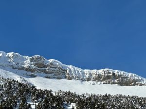 Notre groupe de 7 n’en croit pas ses yeux, c’est une féerie …Nous avançons tranquillement vers le Pas de la Coche ; heureusement il y a quelques traces et on progresse sans peine. La Montagnette est méconnaissable, énorme dôme de crème parsemée de quelques nougatines : des petits pins recouverts d’une neige subtilement sculptée par le vent laissant entrevoir ici un visage, là un ourson, ailleurs des griffes d’ours.