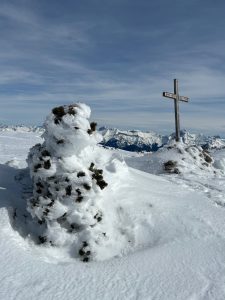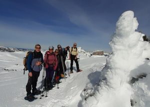 Notre groupe de 7 n’en croit pas ses yeux, c’est une féerie …Nous avançons tranquillement vers le Pas de la Coche ; heureusement il y a quelques traces et on progresse sans peine. La Montagnette est méconnaissable, énorme dôme de crème parsemée de quelques nougatines : des petits pins recouverts d’une neige subtilement sculptée par le vent laissant entrevoir ici un visage, là un ourson, ailleurs des griffes d’ours.