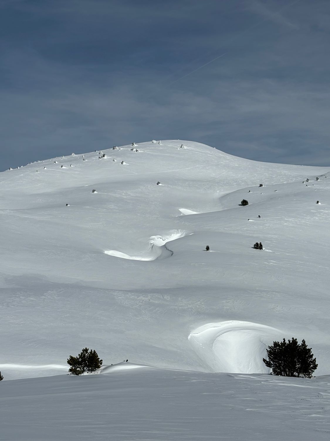 Après la descente dans un joli mais raide petit vallon sous le col du Creuson la fatigue commence à se faire sentir et nous rentrons après les 14 km et 700m de D+ dans une neige extrêmement variée : toujours abondante mais tantôt molle et profonde, tantôt dure et glacée, parfois givrée, plaquée ou crouteuse, souvent crémeuse ; on adore.