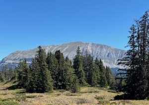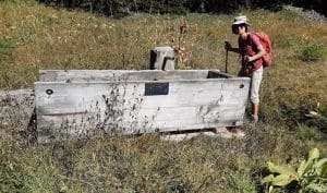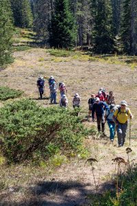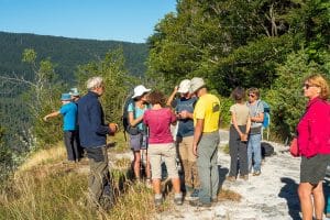 Le chemin du Petit Bois, frais et humide avec sa végétation luxuriante, nous mène entre épicéas et érables à une vaste clairière dominée par Le Grand Veymont qui nous invite faire une pause déjeuner. Ambiance très détendue, les discussions vont bon train, gâteaux et chocolats circulent. On sent un frémissement de fin d’été avec ce petit air frais et ces gentianes altières desséchées. Les ours discutent recettes et ustensiles de cuisson derniers cris. Seraient-ils déjà en train de préparer leur hibernation ?