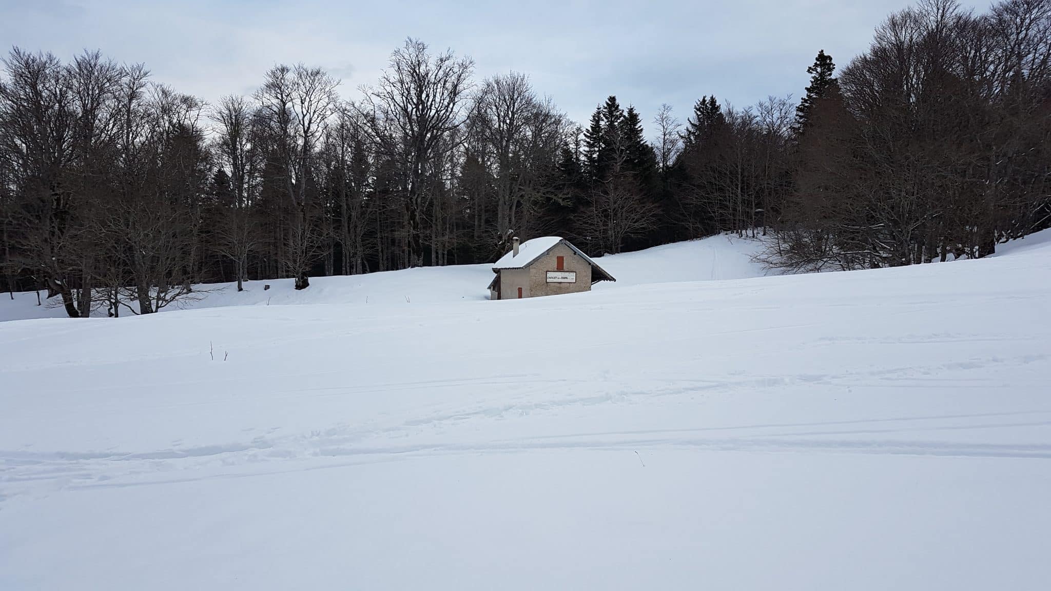 Prémonitoire, nous croisons un lièvre qui se prend pour un chevreuil et un autre quadrupède non identifié. Départ à 8h45, nous passons à côté du chalet des Ours, cher à beaucoup, et remontons vers la crête. La neige, bien que déjà transformée, nous porte bien. Le temps, menaçant au loin, nous offre quelques éclaircies, avec le soleil en prime. Vers le Pas des Écondus nous conduisent nos raquettes.