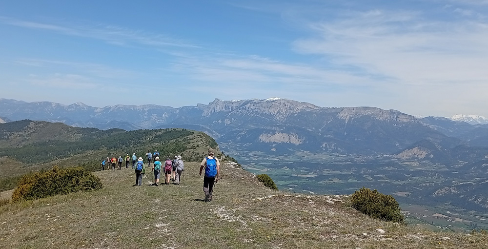 Là, nous découvrons le paysage panoramique qui ne nous quittera plus jusqu’à la descente finale, sous des angles changeants : au sud lointain le Ventoux désormais déneigé, au nord-ouest proche la Servelle et les toujours majestueux Trois Becs en arrière-plan, et du nord au sud-est les falaises du Vercors, notre Dôme du Glandasse toujours coiffé de sa calotte immaculée, l’Oisans, notre Jocou et ses zébrures blanches de printemps, le Dévoluy bien sûr, etc.