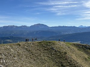 D’ici tout s’adoucit, leurs jambes se reposent un peu puis nouvelle montée raide mais au soleil en direction et jusqu’au sommet du Puy de la Gagère. Il est un peu tôt et les Ours vont à la rencontre d’un groupe de chevaux de toutes les couleurs accompagnés de leurs poulains, très curieux de voir des Ours, ils les encerclent pendant la pause pique-nique, intéressés par la nourriture ? même pas, mais restent durablement autour de nous et très près de nous…