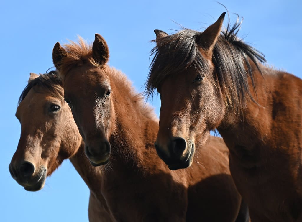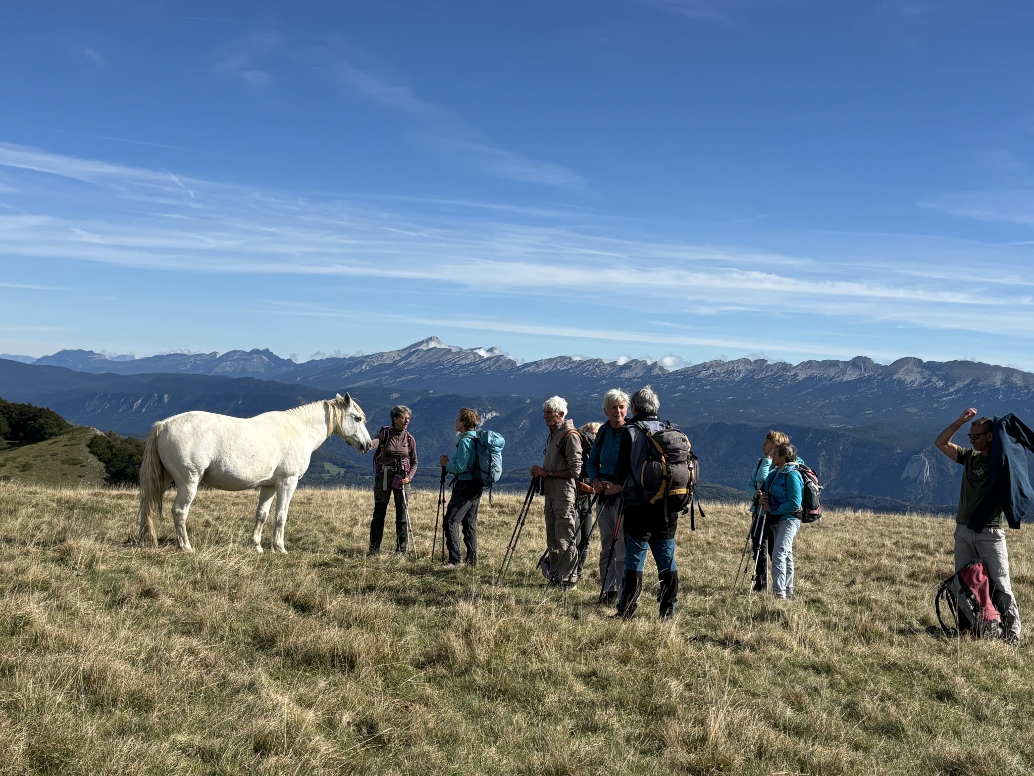 D’ici tout s’adoucit, leurs jambes se reposent un peu puis nouvelle montée raide mais au soleil en direction et jusqu’au sommet du Puy de la Gagère. Il est un peu tôt et les Ours vont à la rencontre d’un groupe de chevaux de toutes les couleurs accompagnés de leurs poulains, très curieux de voir des Ours, ils les encerclent pendant la pause pique-nique, intéressés par la nourriture ? même pas, mais restent durablement autour de nous et très près de nous…