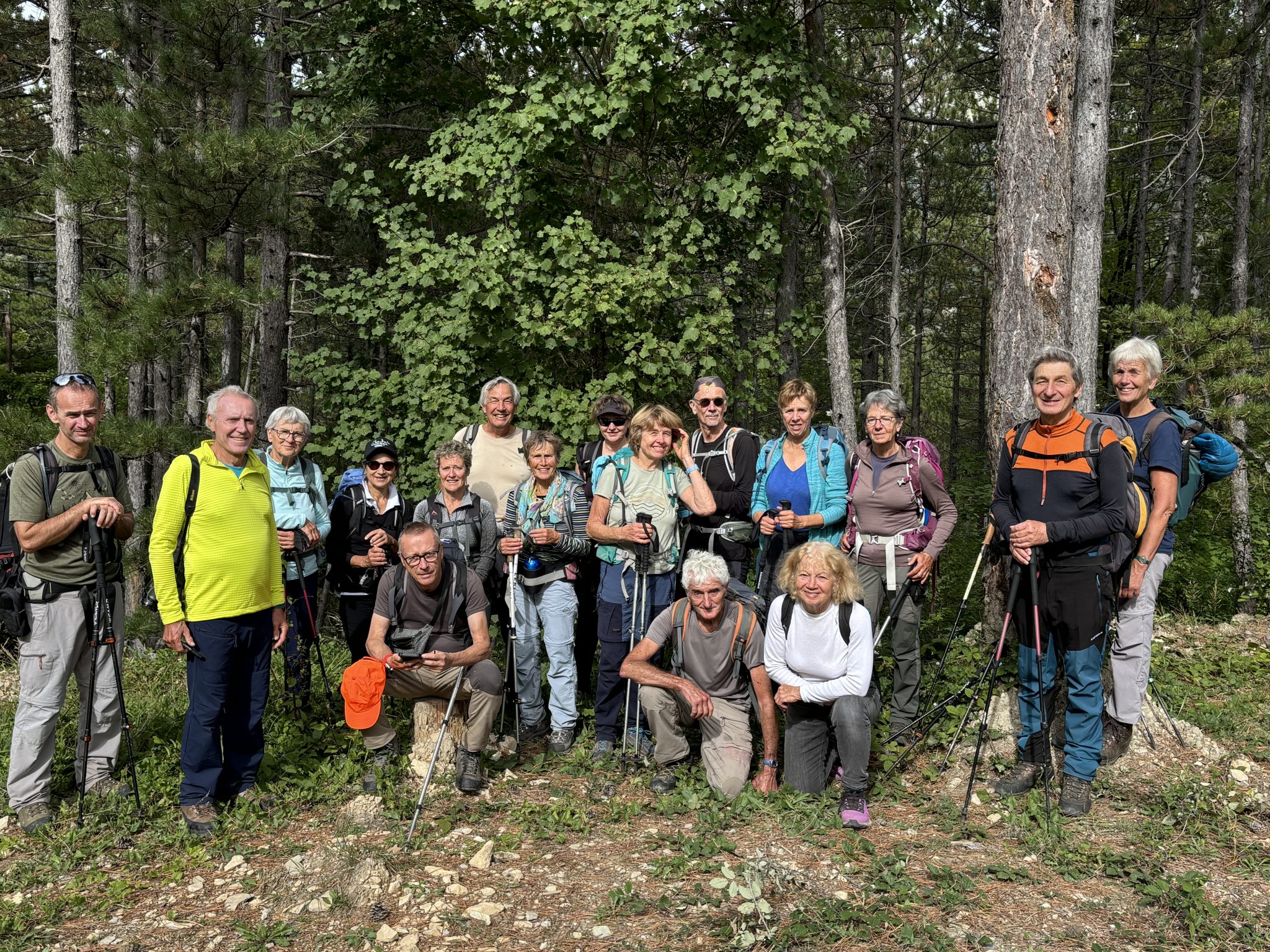 18 Ours/es ont réussi à se rassembler au hameau des Bonnets ce matin, à la fraîche l’herbe pleine de rosée, ils montent par un sentier en forêt , plutôt bien pentu en passant par Jean Jeanne , petite pause devant un chalet sans nom, boire, grignoter avant le col de Font Payanne.