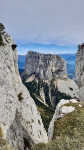 Mais les rochers élancés du Parquet nous observent, alors nous poursuivons vers le large pas de la Selle. Le Grand Veymont et son acolyte se dévoilent. Après la traditionnelle pause méridienne en contrebas du Parquet, avec large vue sur notre Glandasse et la dent de Die, nous repartons et naviguons en longeant les crêtes (autour de 2 000 m) pour découvrir les impressionnantes fentes du Parquet, ces profondes crevasses, réservoirs précieux de neige et d’eau. A chaque trouée, le Mont Aiguille nous apparait sous un nouveau jour. Emouvante rencontre avec un troupeau d’une trentaine de bouquetins paisibles.