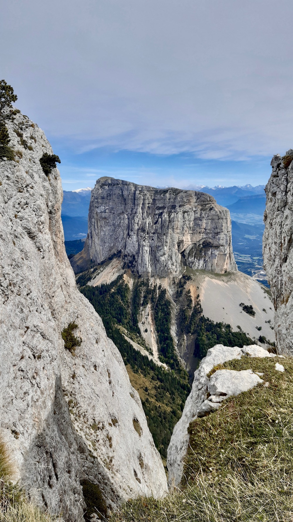 Sur notre droite, le soleil se lève derrière le Mont Aiguille, seigneur des lieux. Il sera notre camarade du jour. Nous ne nous lassons pas d’observer ses parois variées et son socle impressionnant.