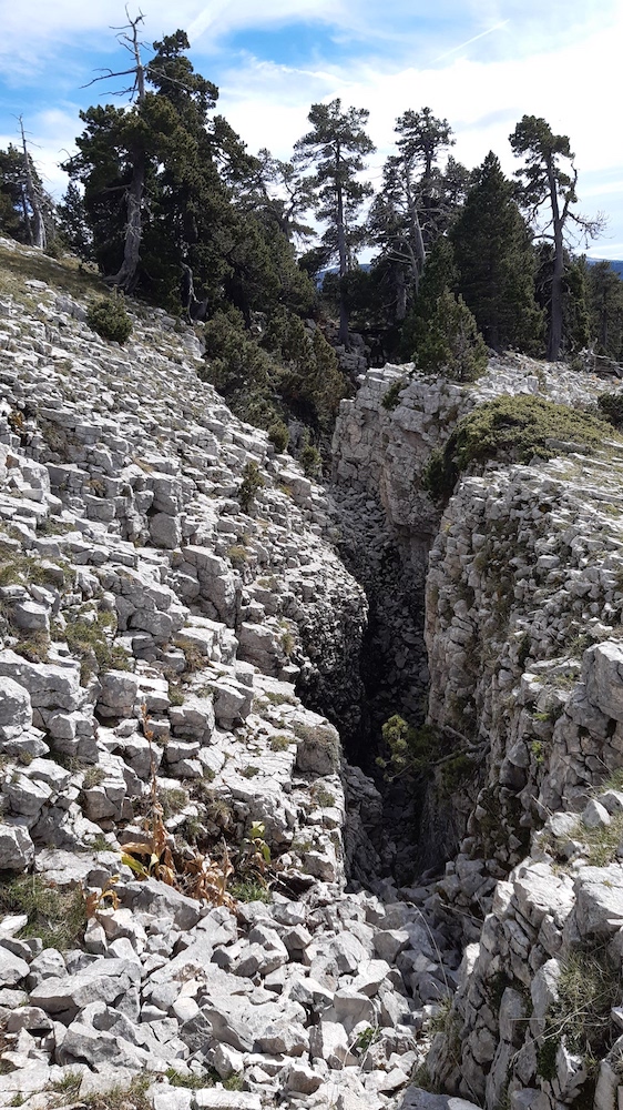 Mais les rochers élancés du Parquet nous observent, alors nous poursuivons vers le large pas de la Selle. Le Grand Veymont et son acolyte se dévoilent. Après la traditionnelle pause méridienne en contrebas du Parquet, avec large vue sur notre Glandasse et la dent de Die, nous repartons et naviguons en longeant les crêtes (autour de 2 000 m) pour découvrir les impressionnantes fentes du Parquet, ces profondes crevasses, réservoirs précieux de neige et d’eau. A chaque trouée, le Mont Aiguille nous apparait sous un nouveau jour. Emouvante rencontre avec un troupeau d’une trentaine de bouquetins paisibles.