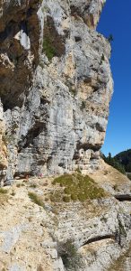 Passés le ruisseau d’Archiane une longue montée en forêt sur lit de feuilles mortes commence et devient bien raide, il nous faut monter + de 600 m de dénivelé pour atteindre les premiers rochers de la vire, les arbres deviennent plus rares et le sentier entre deux falaises sous nos pieds commence à rétrécir, en face de nous, tout au long de la matinée, la vire d’Archiane bien ensoleillée nous dévoile son itinéraire.