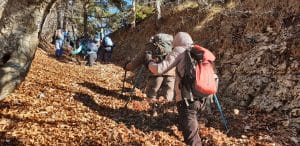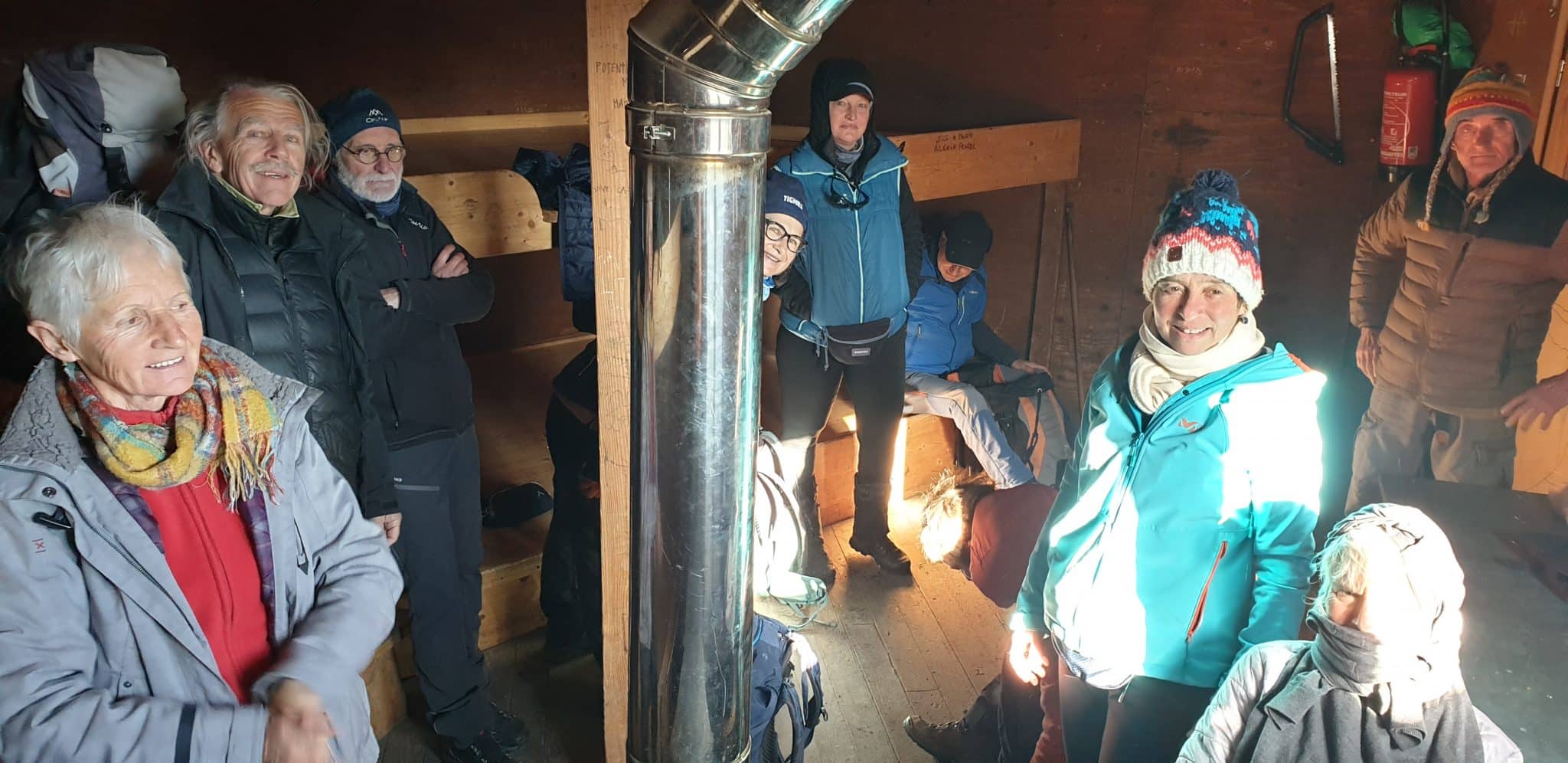 C’est un soulagement de pouvoir pique-niquer à l’intérieur et de profiter des friandises proposées par les uns et les autres. Après ce moment de confort, rassasiés et réchauffés, nous reprenons notre chemin jusqu’au col de la Chau ; de là, dans de belles forêts de hêtres, nous entamons la longue descente qui nous ramènera à notre point de départ.