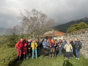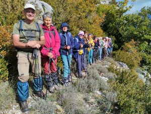 Les nuages sont bien là avec même quelques gouttes, mais Météo France persiste à nous prédire du beau temps, ceci explique-t-il, sans doute, le nombre relatif d’optimistes présents. Qu’importe, nous voilà partis pour un tour de Serre Chauvière au départ du Vieux Montmaur qui nous accueille avec un magnifique arc-en-ciel, c’est beau mais de mauvais présage. Il pleut. Sans plus se poser de questions, nous entamons la piste puis un sentier de plus en plus raide vers le Pas des Baux et sa marne grise, bien collante aujourd’hui. A partir de là, le sentier file droit dans la pente, la végétation est détrempée et la marche devient compliquée, surtout pour les derniers qui patinent allègrement. Heureusement l’optimisme et la solidarité des Ours viendra à bout de l’ascension et l’effort sera récompensé par le panorama aérien du Pas d’Aix où nous rejoignons le sentier ancestral menant au plateau. La Drôme et le Bès se rejoignent dans la plaine en dessous sans artifices, offrant une vision bucolique et rassurante de ce lieu.