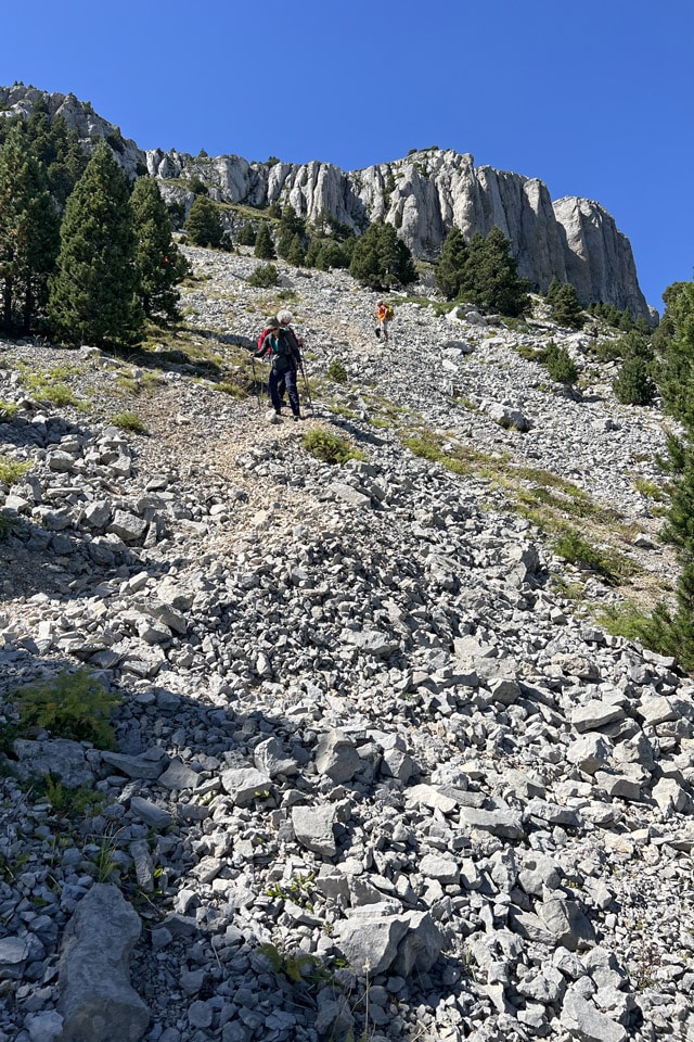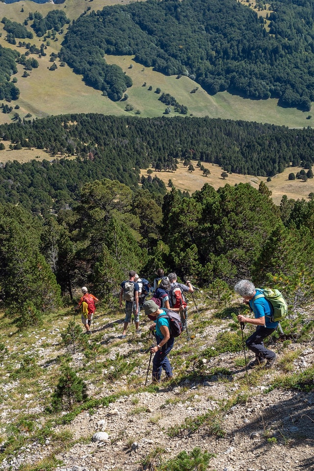 Nous arrivons au bout des crêtes, et puis nous tournons à gauche dans le fameux Grand Pas : d’abord très caillouteux, ensuite plus vert, mais longtemps raide de chez raide. Une dizaine de km et un peu moins de 700 m pour cette belle sortie.