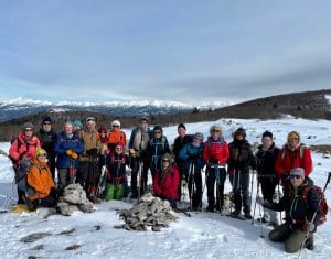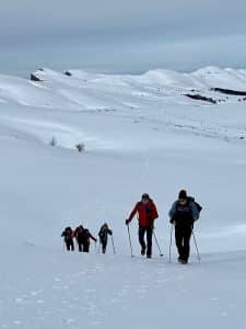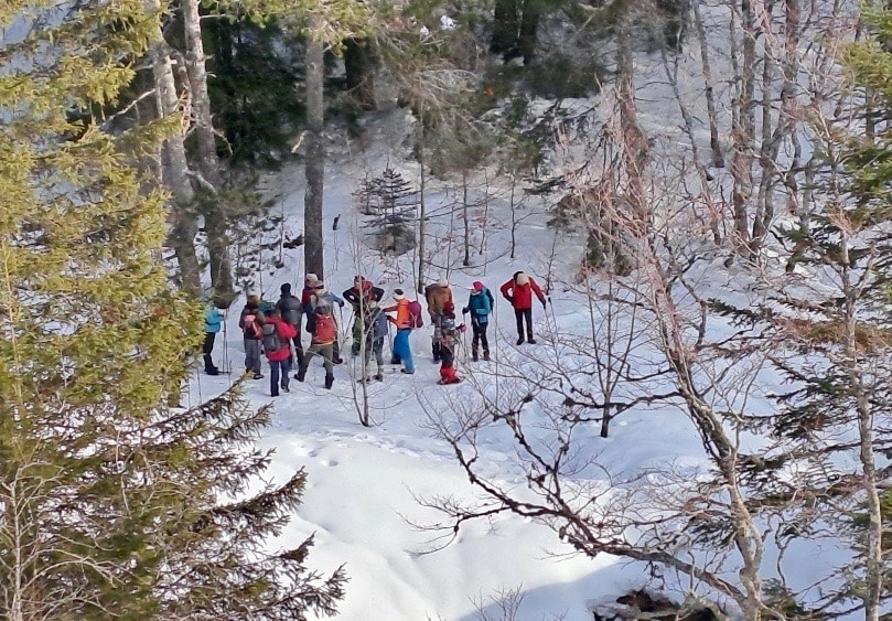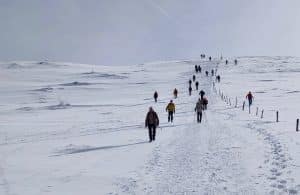 Mais si !… Font d’Urle sans vent et paisible, c’est possible. C’est ce que nous, 20 Ours(e)s, avons découvert avec bonheur, ce matin, sous la houlette de Valérie. Chaussés de crampons, raquettes ou semelles nues, nous démarrons du col de La Chau pour grimper vers le Puy de la Gagère. Le ciel est très couvert vers le sud mais prometteur vers le nord.