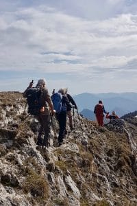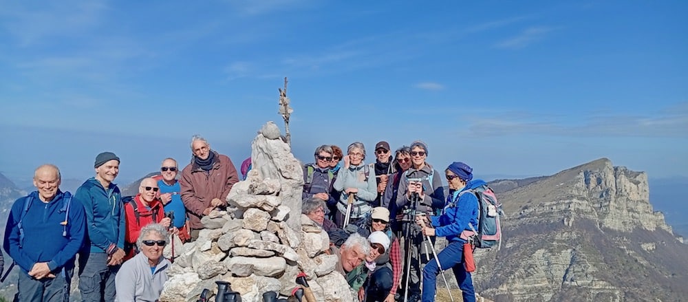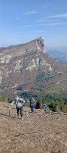 Ce dimanche, dans la fraîcheur matinale, une belle vingtaine d’Ours-es, est partie de la Fontaine de la Sourde. Elle a serpenté allègrement dans la forêt, sur une pente plutôt raide, avant d’atteindre le soleil et la vue sur l’autre versant : les Trois Becs, le premier, large et solide, semble encore appartenir aux pâturages ; le second se redresse davantage, plus minéral ; le troisième accroche le regard : une dent claire, presque aiguë, qui découpe le ciel.