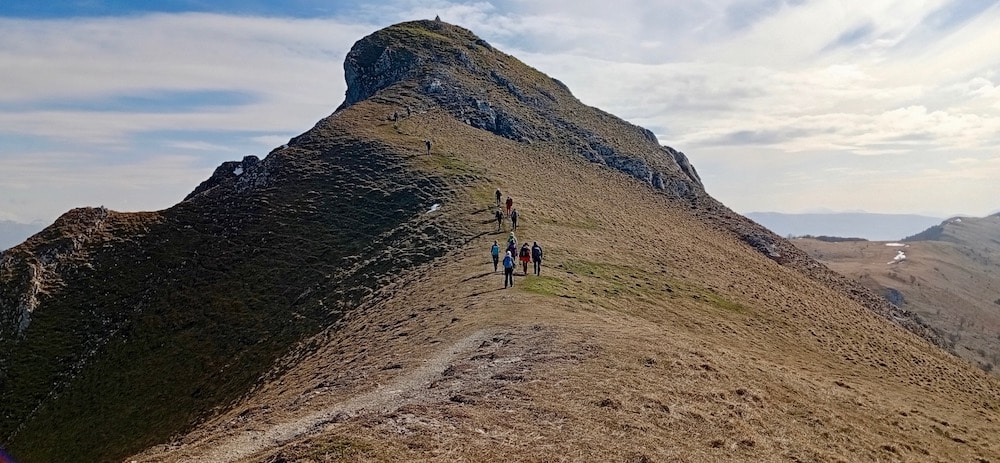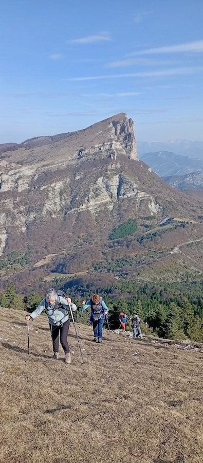 La troupe a continué sa progression vers le point culminant, le Grand Delmas, à 1540 m. Les conditions favorables encourageaient la poursuite de l’aventure. Le groupe s’est étiré sur la crête du Rocher de la Cognette, savourant le panorama, et, comme frappée par un enchantement, s’est arrêtée dans le pré du Bœuf, bout de steppe abrité, fleuri de crocus. Chacun.e s’est installé.e avec le désir de rester là.