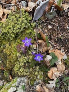 Nos pas font un doux chuintement dans une épaisse couche de feuilles, les fleurs de printemps (hépatiques, violettes et primevères) se côtoient en bordure. Arrivés vers le Bois de Savel, la pente se raidit franchement et nous repartons vers l’Ouest en direction des fameux Rochers des Blaches.
