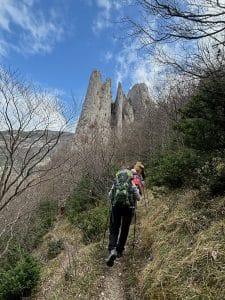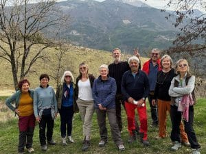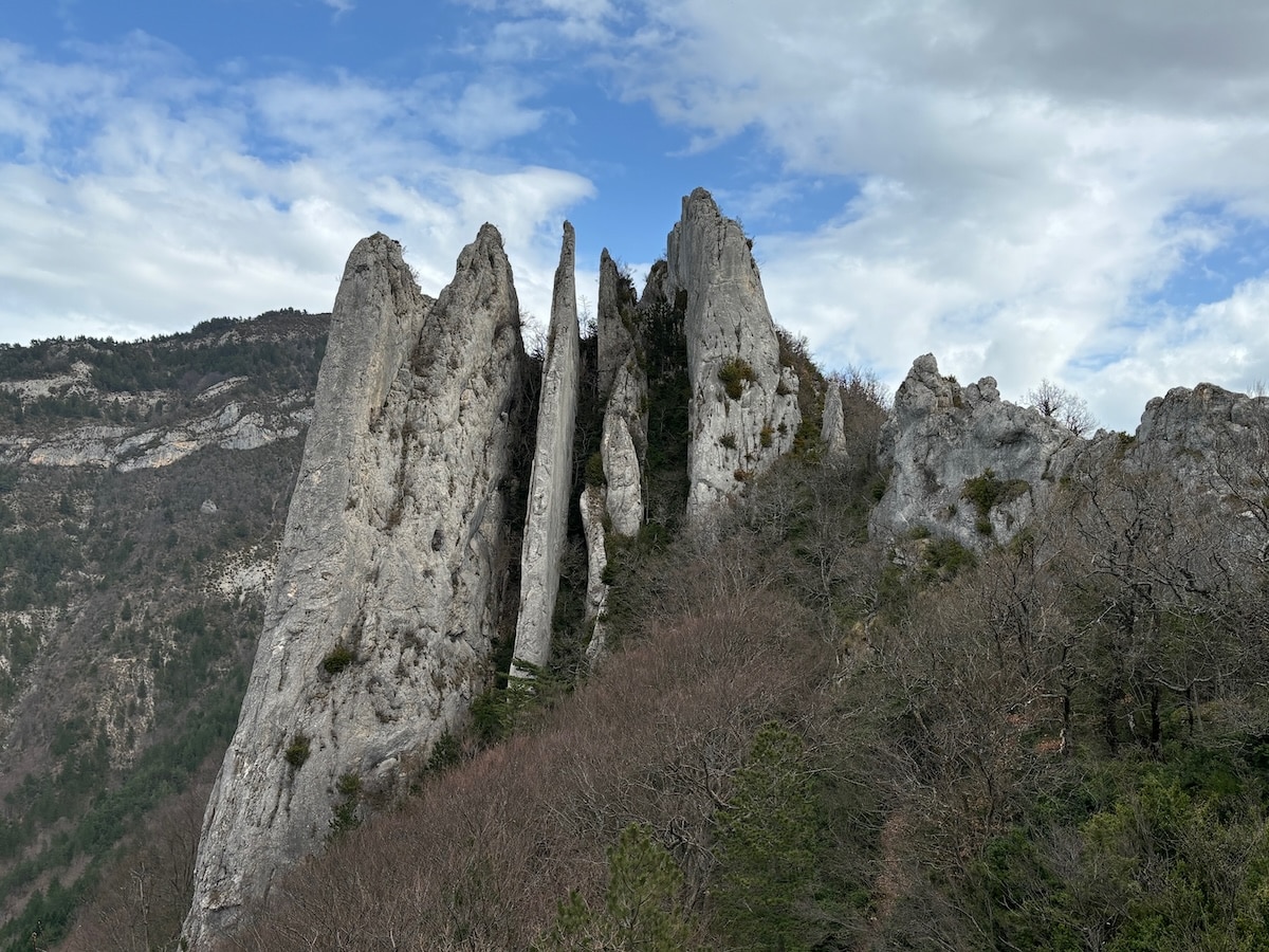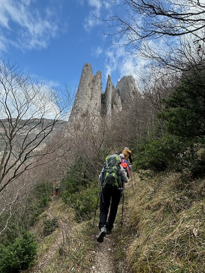 Départ de Pennes le Sec pour cette rando printanière. Le groupe de 11 (8 ours(e)s et leurs 3 invité(e)s) démarre tranquillement sur la route en direction de la vallée de la Roanne et d’un coup l’un d’eux qui connait bien le coin propose d’emblée un raccourci très raide pour rejoindre la piste initialement prévue. De quoi affoler nos invités peu habitués aux variantes des Ursidés. Mais l’idée est bonne et une fois la piste rejointe nous profitons de la belle vue sur les 3 Becs et le Grand Delmas tout en cheminant facilement vers les falaises que nous contournons pour reprendre un bon sentier presque horizontal en sous-bois.
