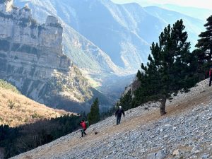 Après la citerne, les ours.es rejoignent le Pas du Pastel pour redescendre, sous la falaise du Rancou. Ils s’engagent dans un couloir vertigineux qui requiert toute leur attention, s’ensuit la traversée d’un imposant pierrier. La course finale dans les éboulis les réjouit.