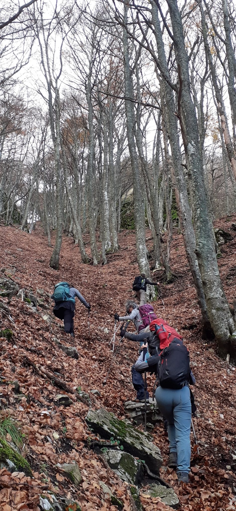 Nous sommes huit Ours.es au parking des Auberts sur la route du col de la Chaudière. Nous démarrons fort : droit dans la pente, 600 m de dénivelé raide +++, sous nos pas les feuilles mortes et l’humidité ne facilitent pas la progression.