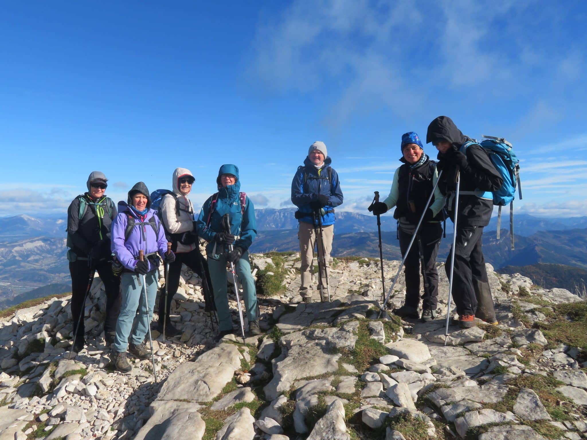 Pour une Ourse des randos loisirs, c’est un baptême costaud, la pente atteint parfois 45°. Au Pas des Auberts le vent du nord violent nous accueille à grand renfort de rafales, il faut vite se vêtir pour ne pas «geler» sur place. Successivement deux chamois tout proches et peu farouches se laissent observer avant de s’enfoncer en forêt. De crête en crête nous admirons, sous un beau soleil, le panorama avec au loin les montagnes enneigées, même le Grand Veymont est couronné, et en premier plan des colonnes rocheuses que l’on ne soupçonne pas du fond de la vallée.