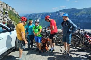 Un beau parcours avec les gorges de Combe Laval en toile de fond, des sous-bois bien ombragés pour ne pas avoir trop chaud, un bel endroit pour casser la croûte, une bonne petite descente avec quelques cailloux pour se rappeler qu’on est en forêt, des troncs d’arbres en travers du chemin. Tout pour une sortie réussie. Même pas une petite chute.